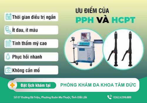 ✤ Phương pháp HCPT: Hoạt động dựa trên nguyên lý nhiệt nội sinh với sóng điện cao tần. Phương pháp này làm máu đông thắt các mạch máu, sau đó dùng dao điện cắt bỏ những búi trĩ ngoại, làm lành vết nứt hậu môn hay đóng lỗ rò hậu môn… nhanh chóng, tránh tổn thương các tế bào khỏe mạnh xung quanh.